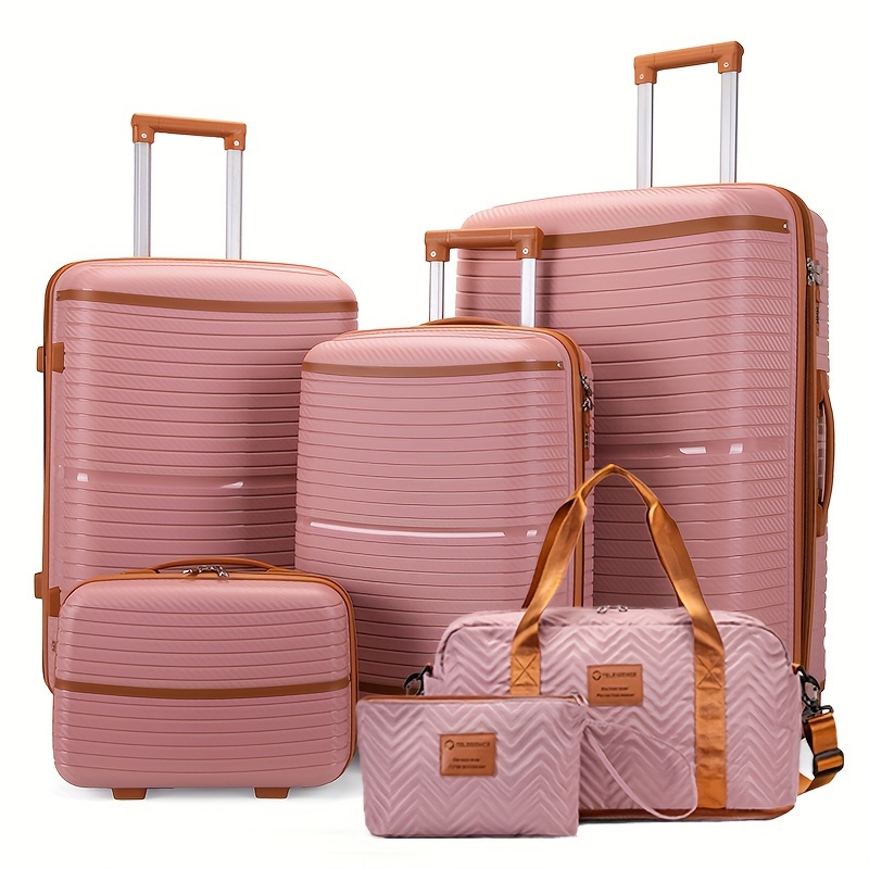 Introducing the New all-brown color PP trolley case 13+20+24+28-inch zipper universal wheel travel trolley case + makeup bag travel bag six-piece set, a perfect blend of innovation and functionality.